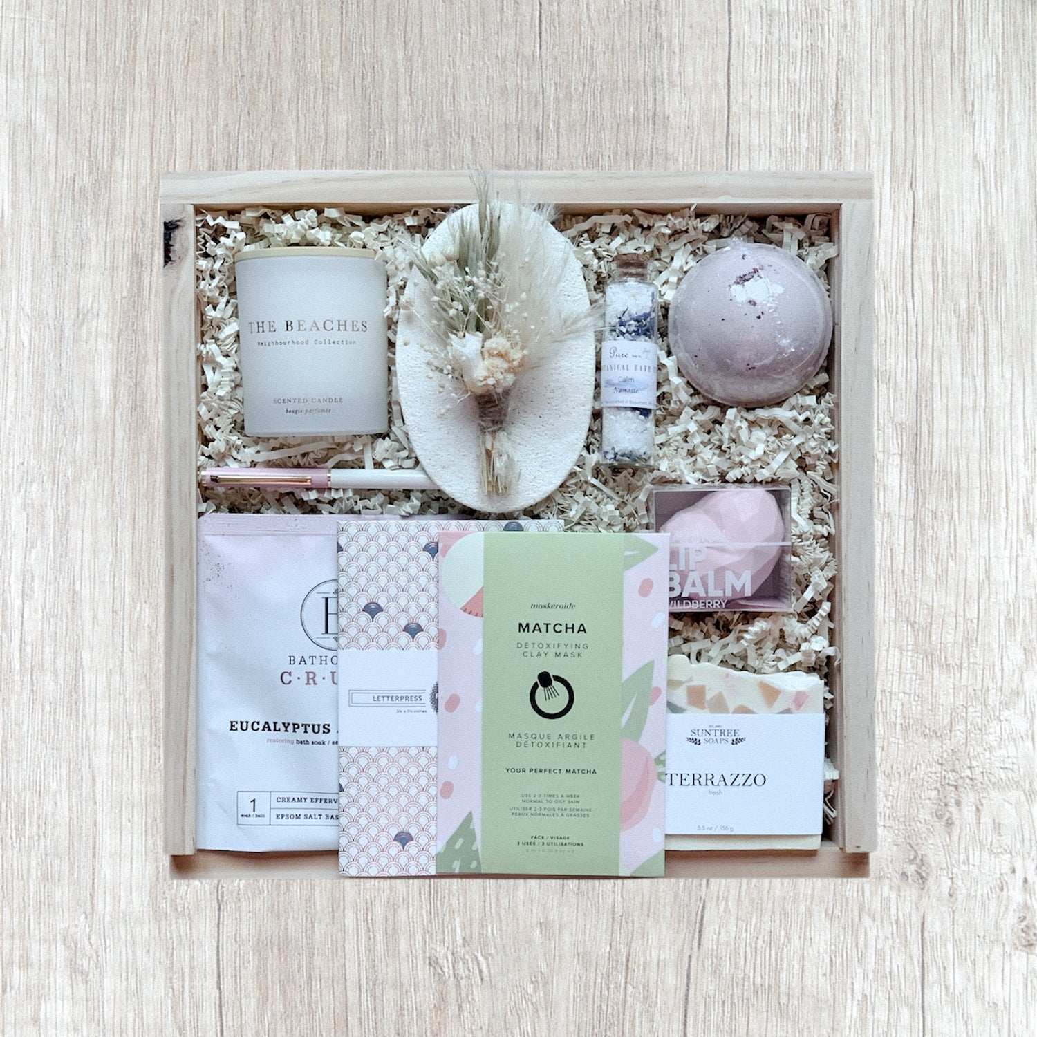 Our curated gift boxes are designed to help people relax and unwind with the things they need. Each gift box comes with products from local businesses across Canada. With our self-care gift boxes, you can give the gift of relaxation and rejuvenation. Unwind, recharge, and relax —with our care packages that give back.